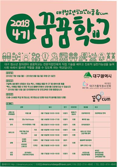 꿈꿈학교는 오는 8월 5일(일)까지 대구청소년창의센터 홈페이지(http://dreamcum.or.kr)를 통해 5개 분야별 청소년 10 ~ 15명을 모집하고 있으며, 8월 10일(금) 오리엔테이션을 시작으로 주 1회 2 ~ 4시간씩 약 10주간 수업이 진행될 예정이다.